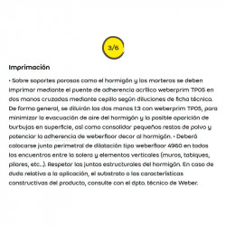 Protector superficial para pavimento impreso. Resina impermeabilizante de acabado para la protección de pavimentos impresos como weberfloor decor y weberfloor print y realzar su textura y color. También puede utilizarse, con el paso del tiempo, para su conservación y mantenimiento. Características principales: Resistencia a las manchas Bajo impacto...